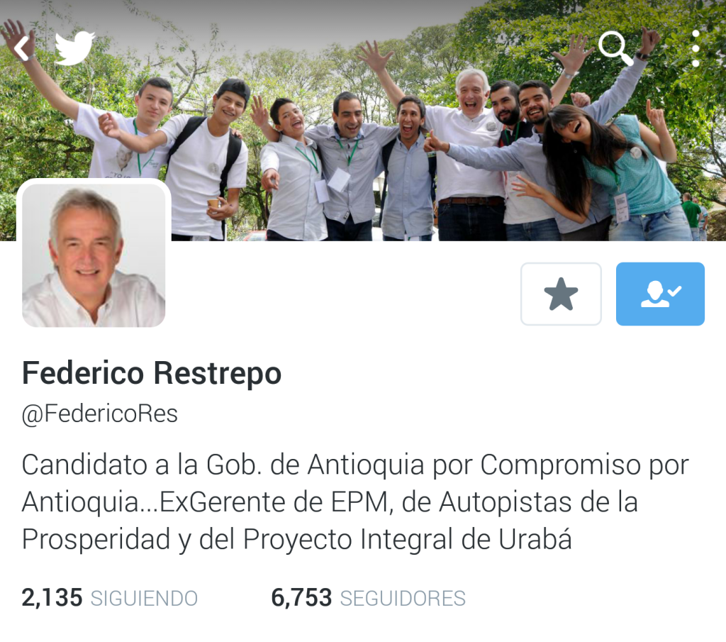 La cuenta de Federico Restrepo parece bastante reciente. Seguramente su participación en política no ha requerido de la elección popular, lo cual es una desventaja notoria para comenzar a involucrar a la población en sus publicaciones. Lo anterior se hace aún más evidente en el tipo de tuits que publica, los cuales generan poco involucramiento. Una campaña política, como lo demostró Antanas Mockus en Colombia, no se gana en redes sociales pero un buen manejo tampoco está de más.