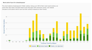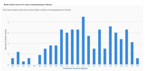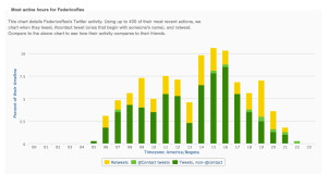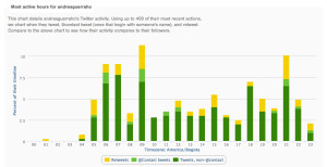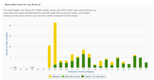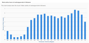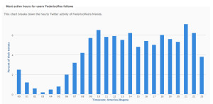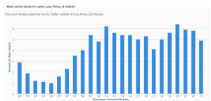 Como veíamos en el informe sobre las cuentas de Twitter de los Candidatos a la Alcaldía de Medellín, es común tener un nivel de fiabilidad cercano a las tres quintas partes de los seguidores, aunque no es lo mejor. Por eso el 81% de fiabilidad que presenta esta cuenta, es una buena cifra que contradice el rumor que se hizo circular en la anterior contienda, de la supuesta compra de seguidores por parte de su campaña. Los followers del exalcalde de Medellín y candidato por el Partido Liberal y Cambio Radical, son especialmente activos en la tarde y en la noche, incluso llegando a la media noche pero las horas de actividad de la cuenta no coinciden con sus seguidores y son especialmente restringidas a las primeras horas del día.