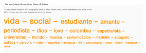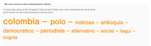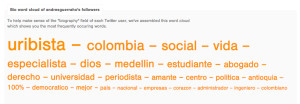 Llama la atención el número de seguidores que tiene por fuera de Colombia. Es especialmente significativo en la península ibérica yen Estados Unidos. Sus followers son bastante activos durante todo el día, desde la 6 de la mañana hasta las 10 de la noche mientras la cuenta del candidato lo es a primera hora de la mañana y al final del día. En su nube de términos la palabra «uribista» resalta sobre el resto, haciendo que el mensaje que trata de comunicarse en la campaña, sea claro y contundente.