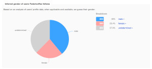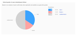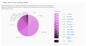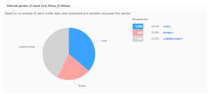 Aunque la mayoría de los usuarios de Twitter no tiene completo su perfil y no indican su género, es importante interactuar tanto con hombres como con mujeres, ya que estas últimas representan la mayoría de la población y del censo electoral colombiano. En el caso de @luis_perez_g el número de hombres seguidos es casi el doble que el de mujeres. Equilibrar esta balanza puede ayudar a mejorar la interacción del candidato con sus posibles electores, en especial cuando la mayoría de las cuentas que sigue, son cuentas de nivel medio con entre 100 y 499 seguidores.