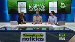 La moderadora y los invitados fueron conversando sobre las implicaciones políticas, constitucionales, estratégicas y psicológicas de la Consulta Popular Anticorrupción, promovida por la pareja conformada por Claudia López y Angélica Lozano y que sirvió de punto de partida para la discusión nacional sobre si se trataba de un evento populista de politización de la moral, con fines electorales, o si se trataba en efecto de un mecanismo idóneo para promover el necesario comportamiento ético en el Estado colombiano.
