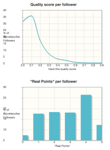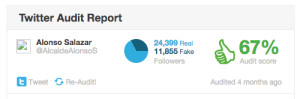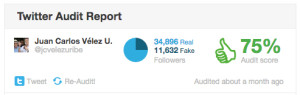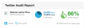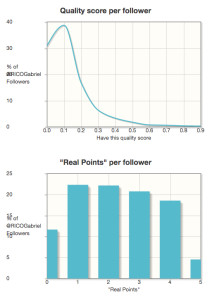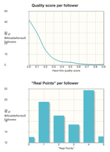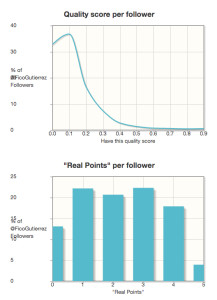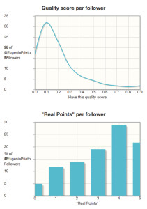 Dos terceras partes de sus seguidores son reales, los demás pueden no serlo o tener cuentas inactivas. La calidad de sus seguidores es baja, lo cual no es extraño en cuentas políticas pues no siempre los seguidores participan activamente. Sin embargo hay un punto extraño y es que el puntaje de sus seguidores muestra que se vinculan poco o mucho, no hay un punto intermedio, con 1 ó 4 en un nivel de 0 a 5.