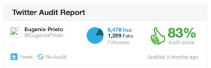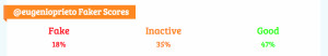La mayoría de sus seguidores son reales con un excelente número del 83%, con baja calidad y buena participación. Esto puede verse en el recuadro referente a Quality Score per follower y Real points per follower lo cual puede deberse a que aunque participan activamente, los seguidores tienen pocos seguidores para sí mismos. El Faker Score lo confirma con una participación cercana al 50%.