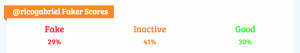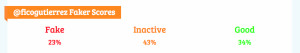 El 65% de sus seguidores puntúan para ser reales. El restante 35% puede ser falso o no actuar en Twitter, lo cual es imposible de diferenciar claramente para el sistema. La calidad de sus seguidores es bastante baja pero participan activamente, más que cualquiera de los demás candidatos. Manteniendo una media por encima de los 15 puntos en el Real Points per follower. El Faker Score muestra que pocos participan mucho pero no logran compensar una inactividad del 43%.